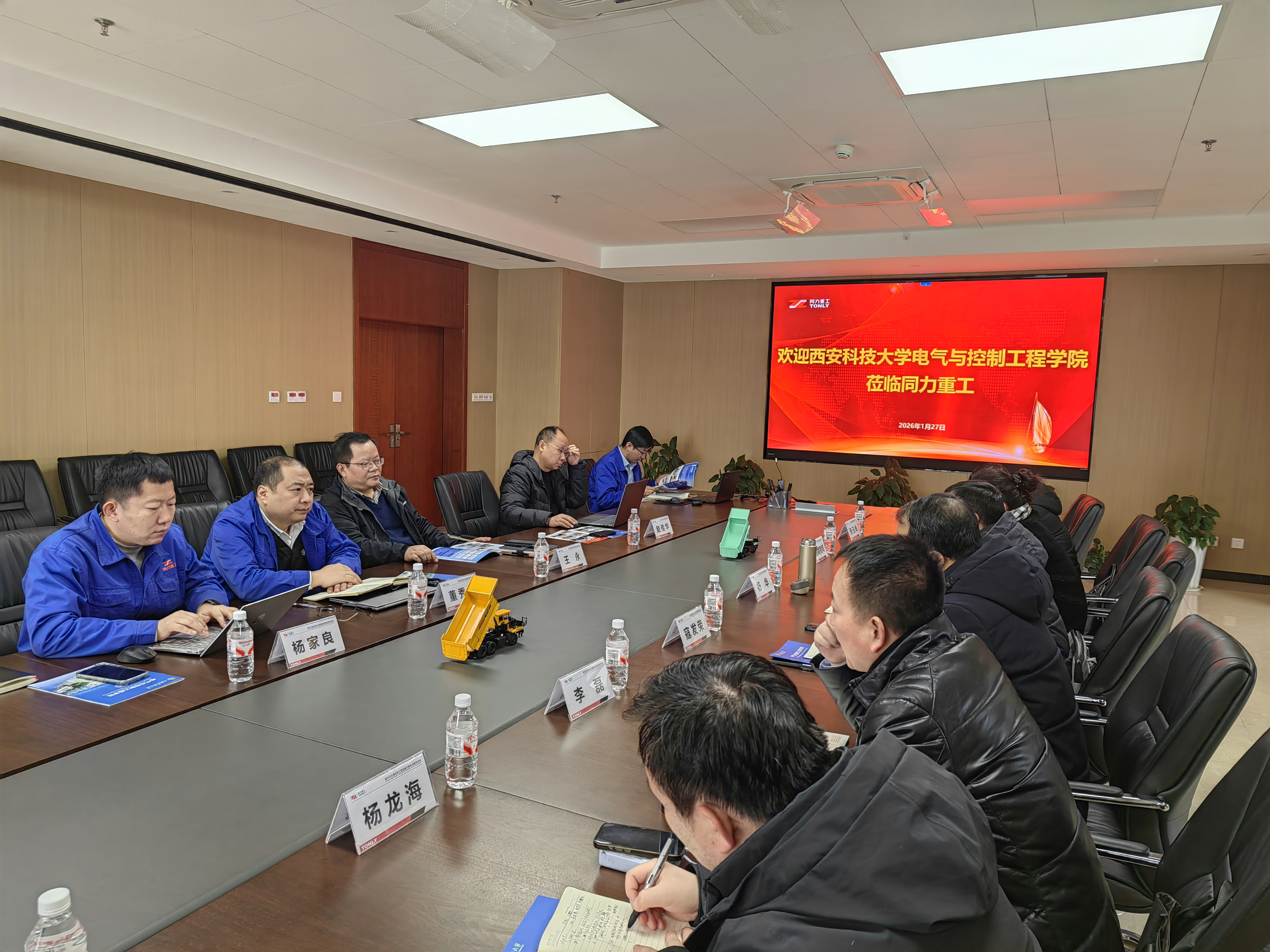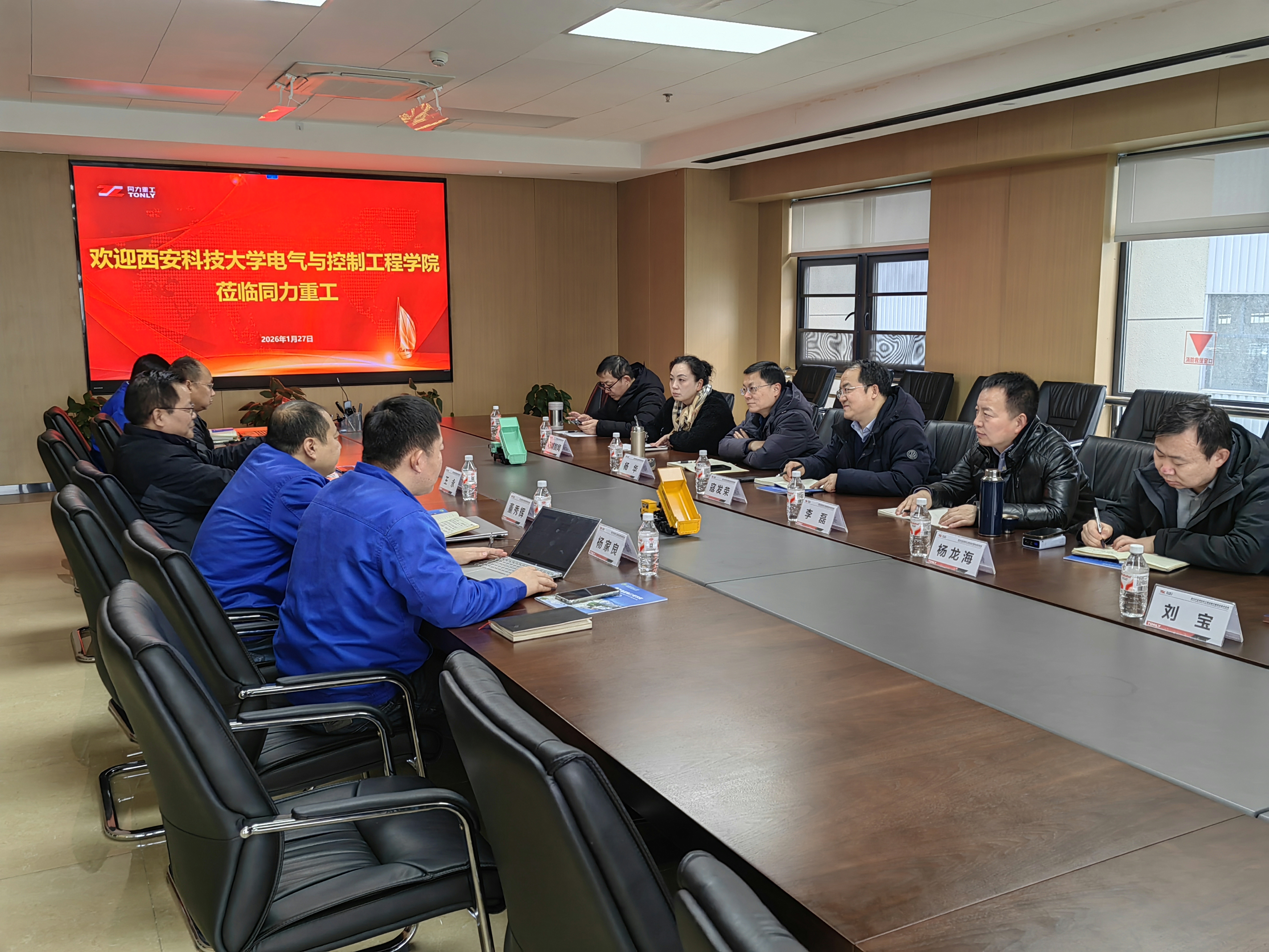 为进一步加强校企协同,深化科教产教融合,提升学生就业质量,1月27日上午,最新bbin官方平台直营网站党委书记杨华、院长寇发荣、党委副书记马婧智闻、电气工程系主任李磊、自动化系主任张玉峰、电子科学系主任杨龙海、测控技术系党支部书记刘宝等一行7人赴陕西同力重工股份有限公司开展访企拓岗合作交流活动。陕西同力重工股份有限公司总工程师王永、副总经理陈朝华、新能源智能科技公司副总经理董秀辉、人力资源总监赵佳华、科技管理部主管杨家良等参加交流座谈会。