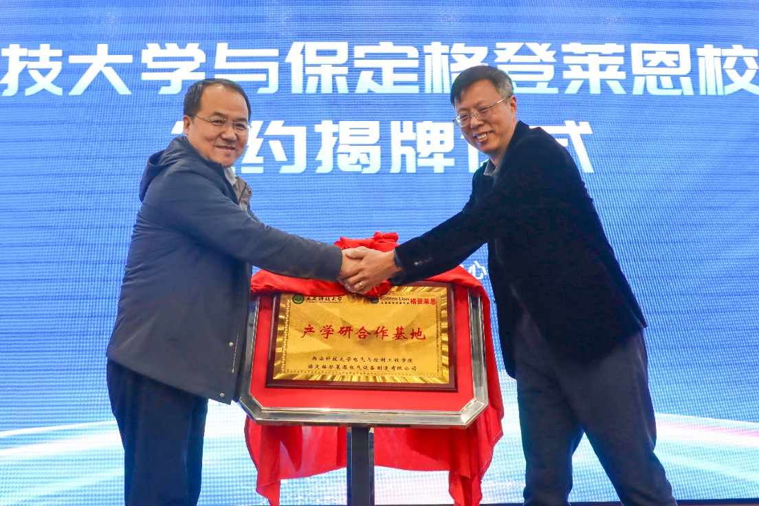 谷佳、寇发荣、李德辉分别致辞,围绕“共赢”核心传递合作愿景,并表示共建产学研合作基地,深化人才培养、技术研发、成果转化等多维度合作,实现高校、企业、区域发展的共赢。在与会嘉宾的见证下,保定格登莱恩与最新bbin官方平台直营网站双方代表签署了校企产学研合作协议,并共同为“最新bbin官方平台直营网站-保定格登莱恩电气设备制造有限公司产学研合作基地”揭牌。